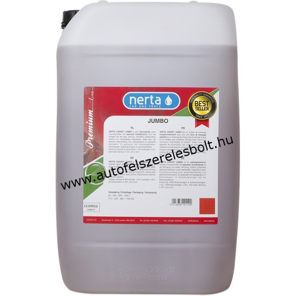 A Nerta Carnet Jumbo egy gyengén alkáli, erősen koncentrált, különleges, összeállítású, személy és tehergépjárművek tisztításához ajánlott termék. A Nerta Carnet Jumbo probléma nélkül tisztítja az úgynevezett sztatikus szennyeződést. A Nerta Carnet Jumbo könnyen eltávolítható és nem hagy fehér foltot. Az összetételének köszönhetően a karosszéria víztaszító és csillogó lesz. A Nerta Carnet Jumbo többféleképpen is felhasználható, de különlegesen erős áztató hatása miatt, porlasztással felhordva, előmosószerként ajánlott. Felhasználható gépi autómosókban, magasnyomású habosító vagy porlasztó készülékkel és a hagyományos kézi tisztítással is.
