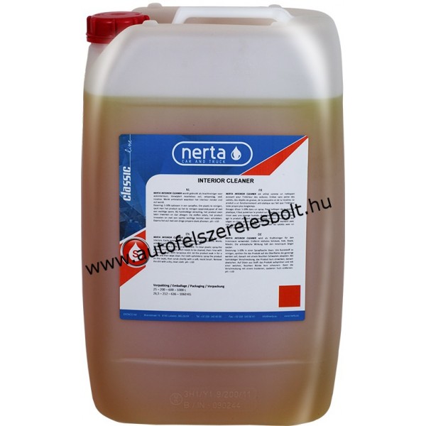 A Nerta Interrior Cleaner, belsőtértisztító-kárpittisztító erős tisztítószer, mely kiválóan alkalmas a gépkocsi belső részeinek tisztítására. Használható szövetkárpit, plüsskárpit, bőr kárpit műszerfal és egyéb műanyag alkatrészek tisztítására. Könnyedén eltávolítja a piszkot, zsírlerakódást, port, nikotint stb. szennyeződéseket. A NERTA INTERIOR CLEANER egy gyengén lúgos kémhatású szer, amelyet a gépjárműszektorban kárpit tisztítására és belsőtér tisztítószerként használnak.