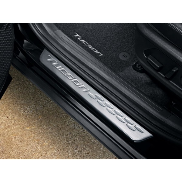 Hyundai Tucson küszöbvédő-borítás. Az első benyomás a legfontosabb. Az autója logójával díszített nemesacél küszöbvédő elemek látványosan köszöntik beszálló utasait. 4 darabos küszöb takaró készlet.