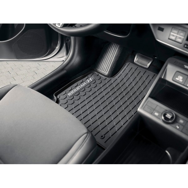 Hyundai Kona gyári gumiszőnyeg, méretpontos, tökéletesen illeszkedő, a vezető oldalon a gyári pontokra a padlóhoz rögzíthető, Kona logóval ellátott gumiszőnyeg. A Hyundai minden időjárás esetén használható gumiszőnyegei ideális védelmet nyújtanak a jármű lábtere számára.
