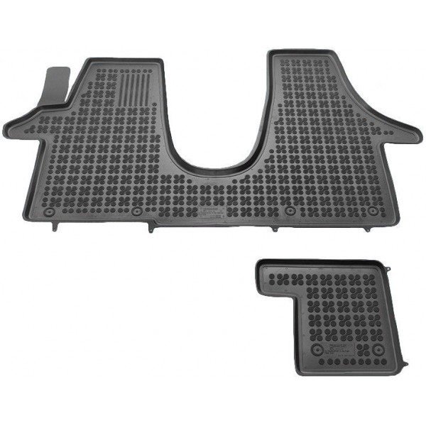 Méretpontos gumiszőnyeg. Gyári minőségű, kopásálló, szagtalan gumiból készült peremes gumiszőnyeg Volkswagen Transporter T6 Multivan 2015-től gyártott autókhoz. Kétrészes autó gumiszőnyeg garnitúra.